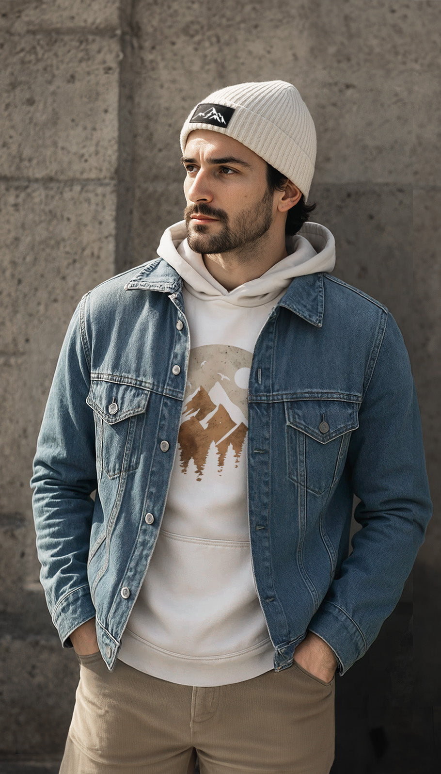 Herren Wintermütze Naturmotiv Beanie mit Patch Aufdruck Berge Wald Wandern Print Strickmütze Rippstrick Neverless®