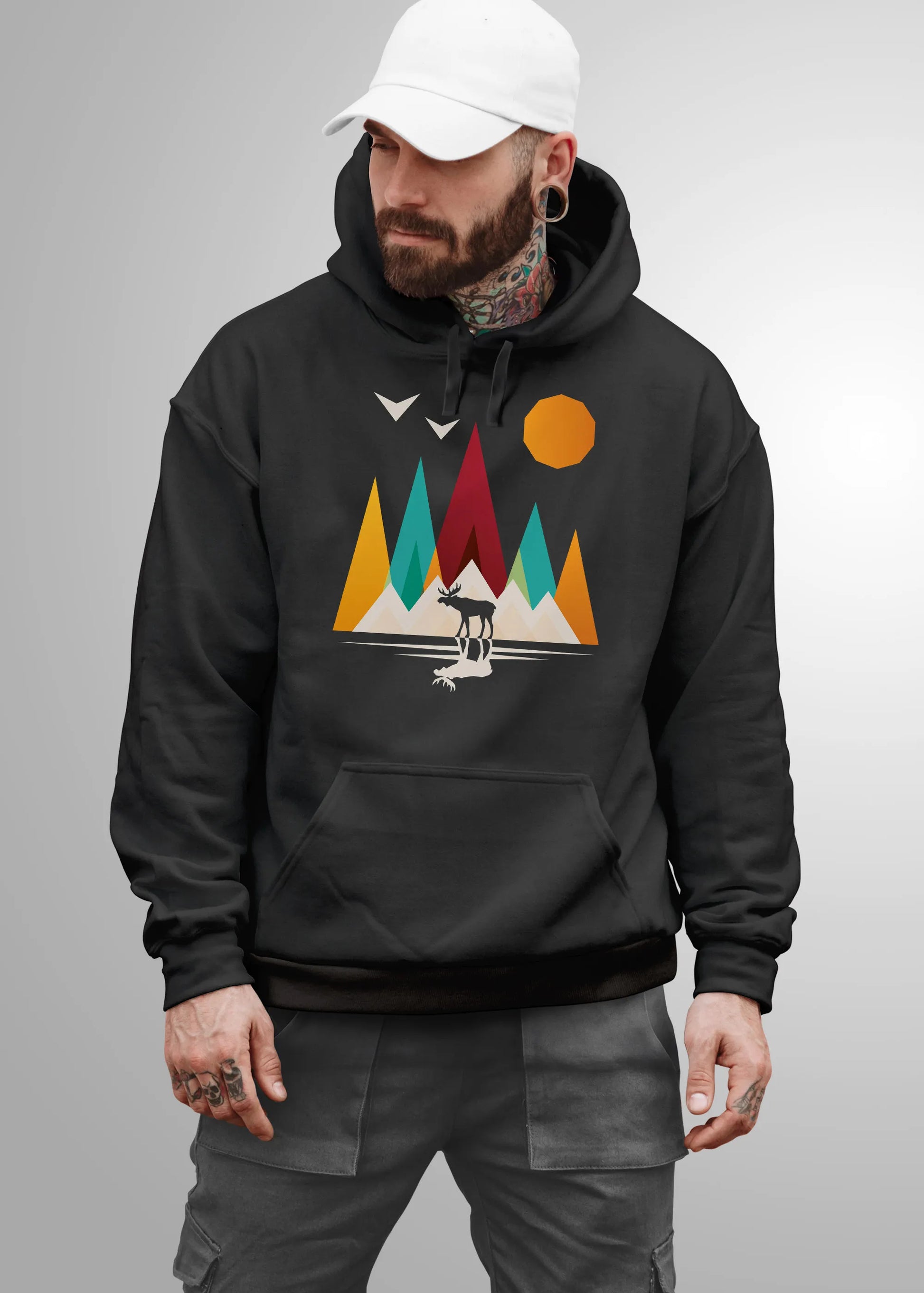 - Outdoor meets Minimalismus – Der lässige Look dieses Kapuzenpullovers mit minimalistischem Frontprint verleiht deinem Outfit einen authentischen, retro-inspirierten Stil. Das abstrakte Natur-Motiv mit Bergen, Elch und Wald ist perfekt für Natur-Liebhaber, die Outdoor-Aktivitäten lieben